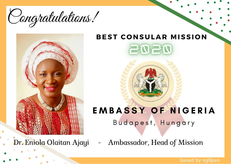 Among those of our consular missions that did their best to accurately inform and serve the public, we selected the five most outstanding ones from five different continents - Africa, Asia, Europe, North America and South America. We further filtered the missions based on the degree in increase of approval ratings by both Nigerians living abroad and citizens of the host country who have sought information and/or consular service from the mission. We will not publish the entire final shortlist which included Canberra under Amb. Bello Kazaure Husseini as High Commissioner, Singapore under H.E. Amb. Ogbole Amedu Ode as High Commissioner, and Moscow under H.E Amb. Steve Davies Ugbah as Ambassador; But the final result did not come as a surprise. The most outstanding Public Service Mission for the year 2020 is the Embassy of the Federal Republic of Nigeria in Budapest, Hungary, under H.E. Ambassador Dr. Eniola Olaitan Ajayi, Head of Mission, for scoring excellently in most of our criteria.