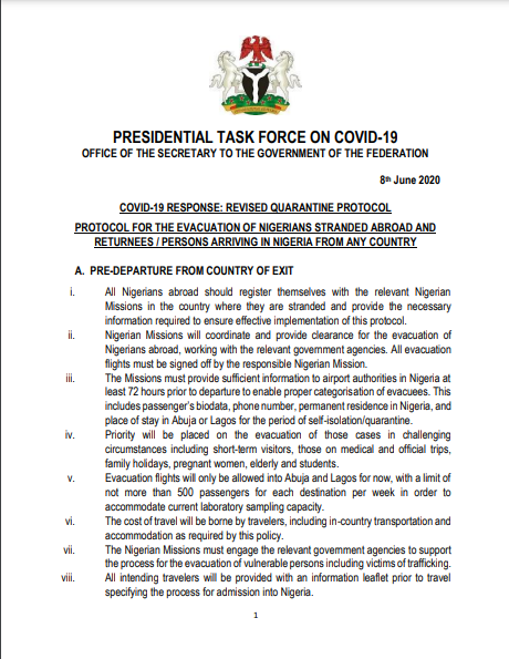 PROTOCOL FOR THE EVACUATION OF NIGERIANS STRANDED ABROAD AND RETURNEES / PERSONS ARRIVING IN NIGERIA FROM ANY COUNTRY