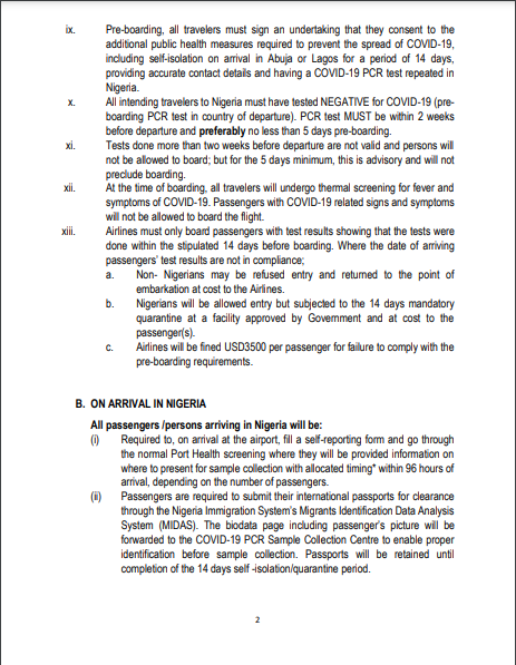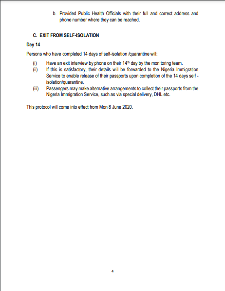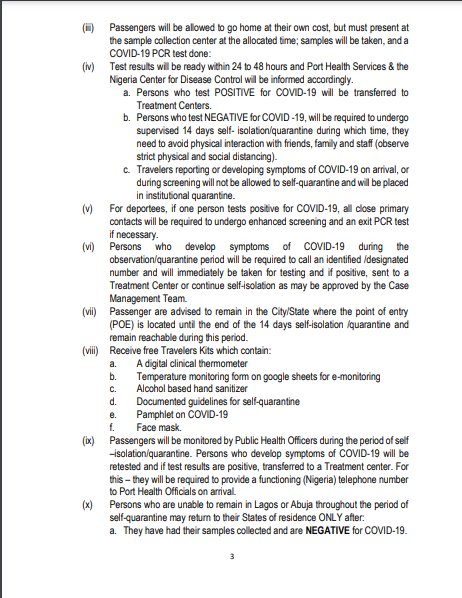 –isolation/quarantine. Persons who develop symptoms of COVID-19 will be retested and if test results are positive, transferred to a Treatment center. For this – they will be required to provide afunctioning (Nigeria) telephone number to Port Health Officials on arrival.