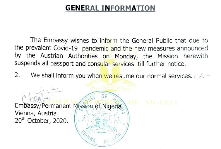 The Nigerian Embassy in Vienna wishes to inform the General Public that due to the Prevalent Covid-19 Pandemic and the new measures announced by the Austrian Authorities, the Mission herewith suspends all passport and consular services tilll further notice.