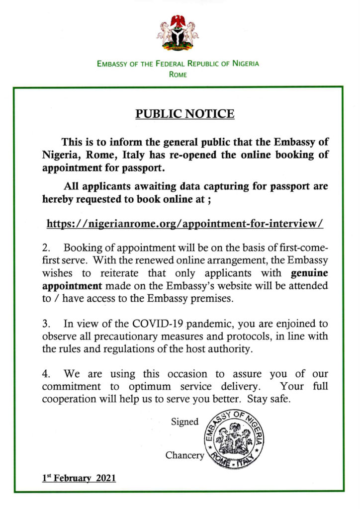 This is to inform the general public that the Nigerian Embassy in Rome has re-opened online booking of appointment for passport.