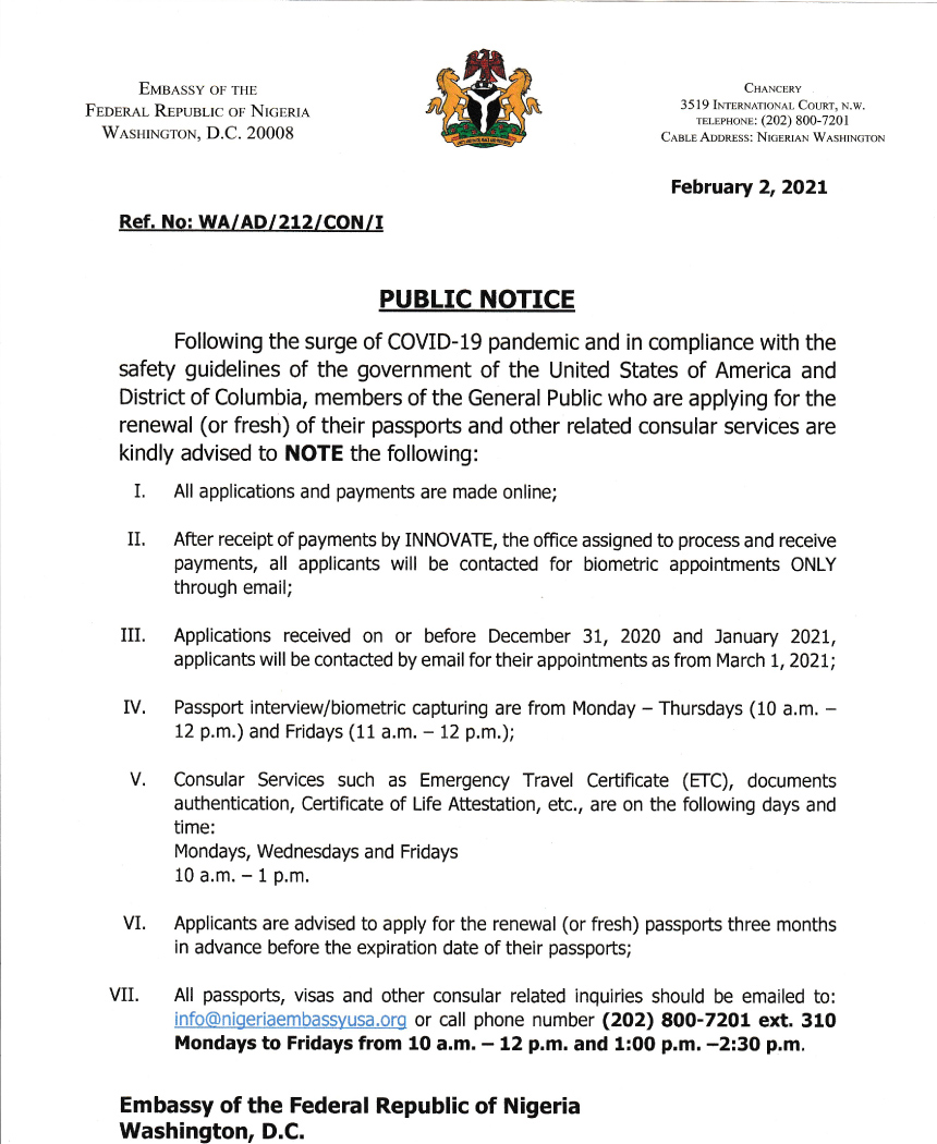 Following the surge of the COVID-19 Pandemic and in compliance with the safety guidelines of the government of the United States of America and District of Columbia, members of the General Public who are applying for fresh passport or passport renewal and other related consular services are kindly advised to note as attached.