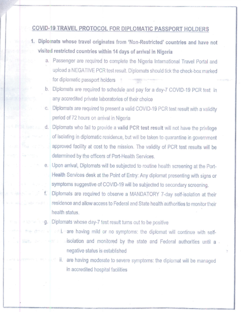 Returning Nigerian diplomats or holders of diplomatic passports will comply with all extant Covid-19 entry rules and regulations