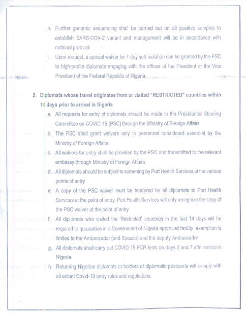 All diplomats shall carry out COVID-19 PCR tests on days 2 and 7 after arrival in Nigeria