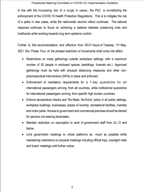 In line with the increasing risk of a surge in cases, the PSC is re-instituting the enforcement of the COVID-19 Health Protection Regulations. This is to mitigate the risk of a spike in new cases, while the nationwide vaccine rollout continues. The national response continues to focus on achieving a balance between preserving lives and livelihoods while working towards long term epidemic control.
