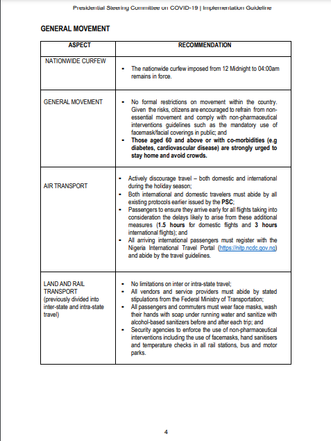 | AIR TRANSPORT | ▪ Actively discourage travel – both domestic and international during the holiday season; ▪ Both international and domestic travelers must abide by all existing protocols earlier issued by the PSC; ▪ Passengers to ensure they arrive early for all flights taking into consideration the delays likely to arise from these additional measures (1.5 hours for domestic flights and 3 hours international flights); and ▪ All arriving international passengers must register with the Nigeria International Travel Portal (https://nitp.ncdc.gov.ng) and abide by the travel guidelines. |