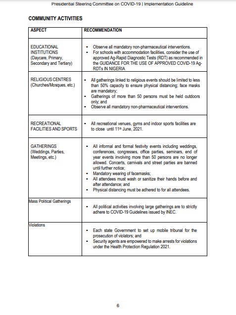 ▪ All informal and formal festivity events including weddings, conferences, congresses, office parties, seminars, end of year events involving more than 50 persons are no longer allowed. Concerts, carnivals and street parties are banned until further notice; ▪ Mandatory wearing of facemasks; ▪ All attendees must wash or sanitize their hands before and after attendance; and ▪ Physical distancing must be adhered to for all attendees. Mass Political Gatherings ▪ All political activities involving large gatherings are to strictly adhere to COVID-19 Guidelines issued by INEC. Violations ▪ Each state Government to set up mobile tribunal for the prosecution of violators; and ▪ Security agents are empowered to make arrests for violations under the Health Protection Regulation 2021. |