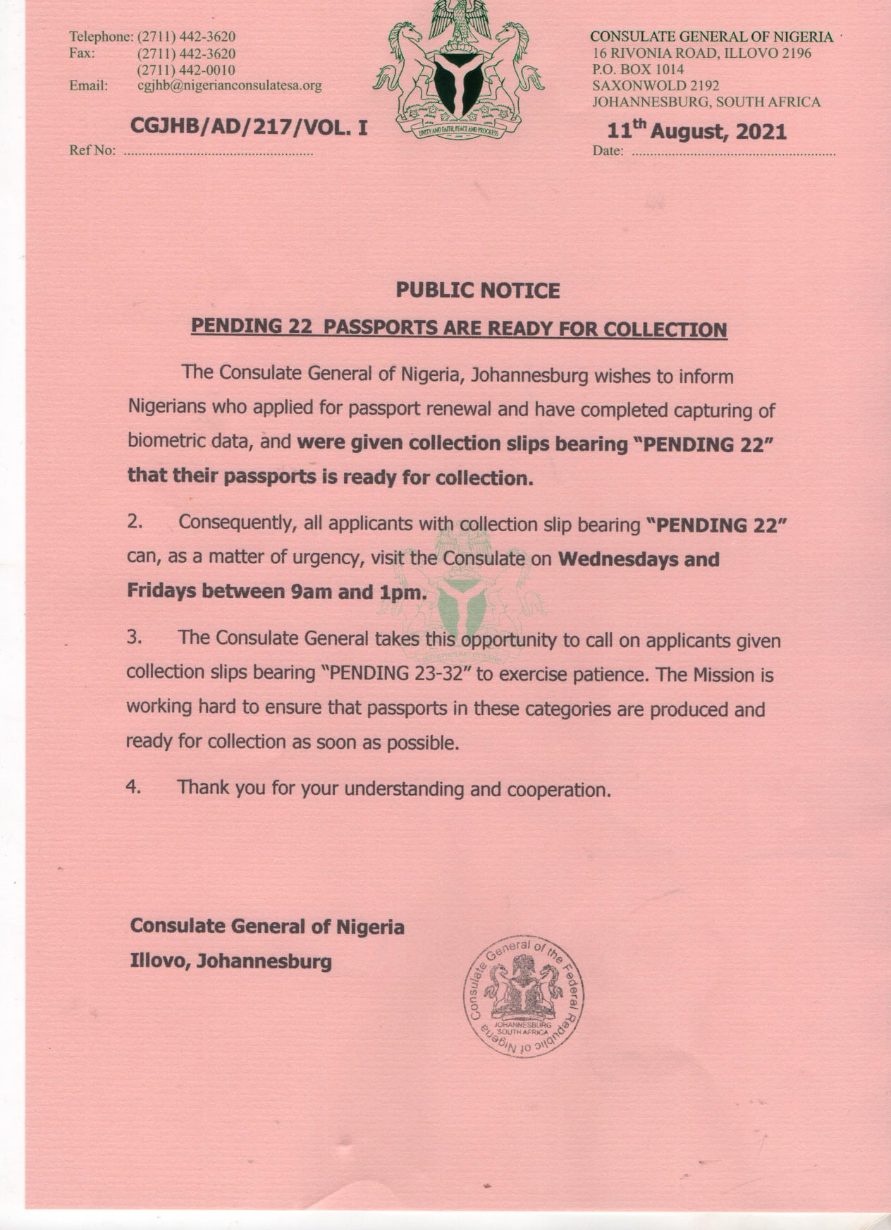 The Consulate General of Nigeria, Johannesburg wishes to inform Nigerians who applied for passport renewal and have completed capturing of biometric data, and were given collection slips bearing "PENDING 22" that their passports are ready for collection.