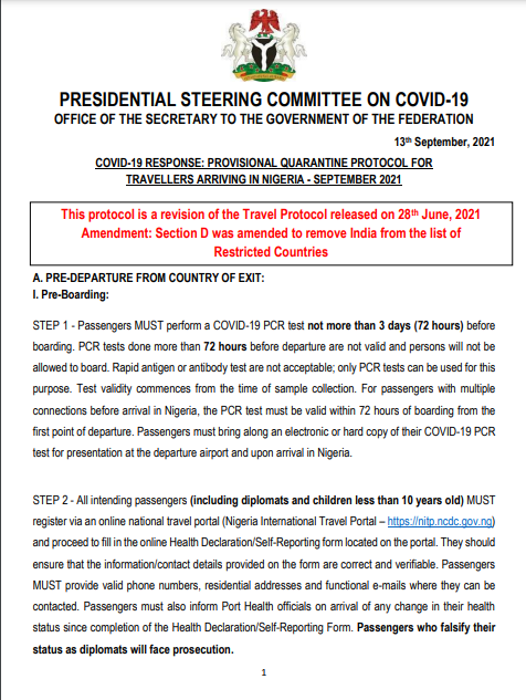 TRAVELLERS ARRIVING IN NIGERIA - SEPTEMBER 2021