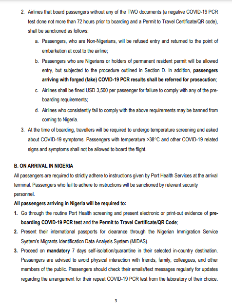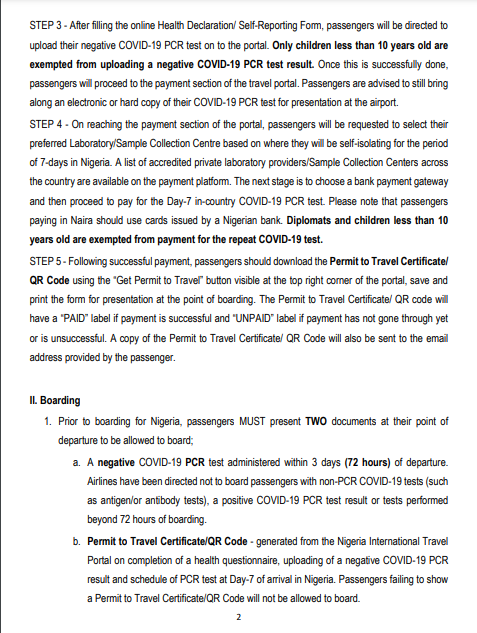 b. Permit to Travel Certificate/QR Code - generated from the Nigeria International Travel Portal on completion of a health questionnaire, uploading of a negative COVID-19 PCR result and schedule of PCR test at Day-7 of arrival in Nigeria. Passengers failing to show a Permit to Travel Certificate/QR Code will not be allowed to board.