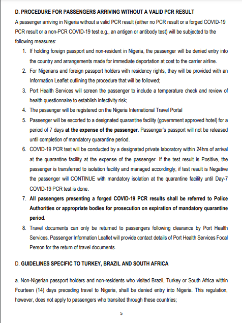 A passenger arriving in Nigeria without a valid PCR result (either no PCR result or a forged COVID-19 PCR result or a non-PCR COVID-19 test e.g., an antigen or antibody test) will be subjected to the following measures: