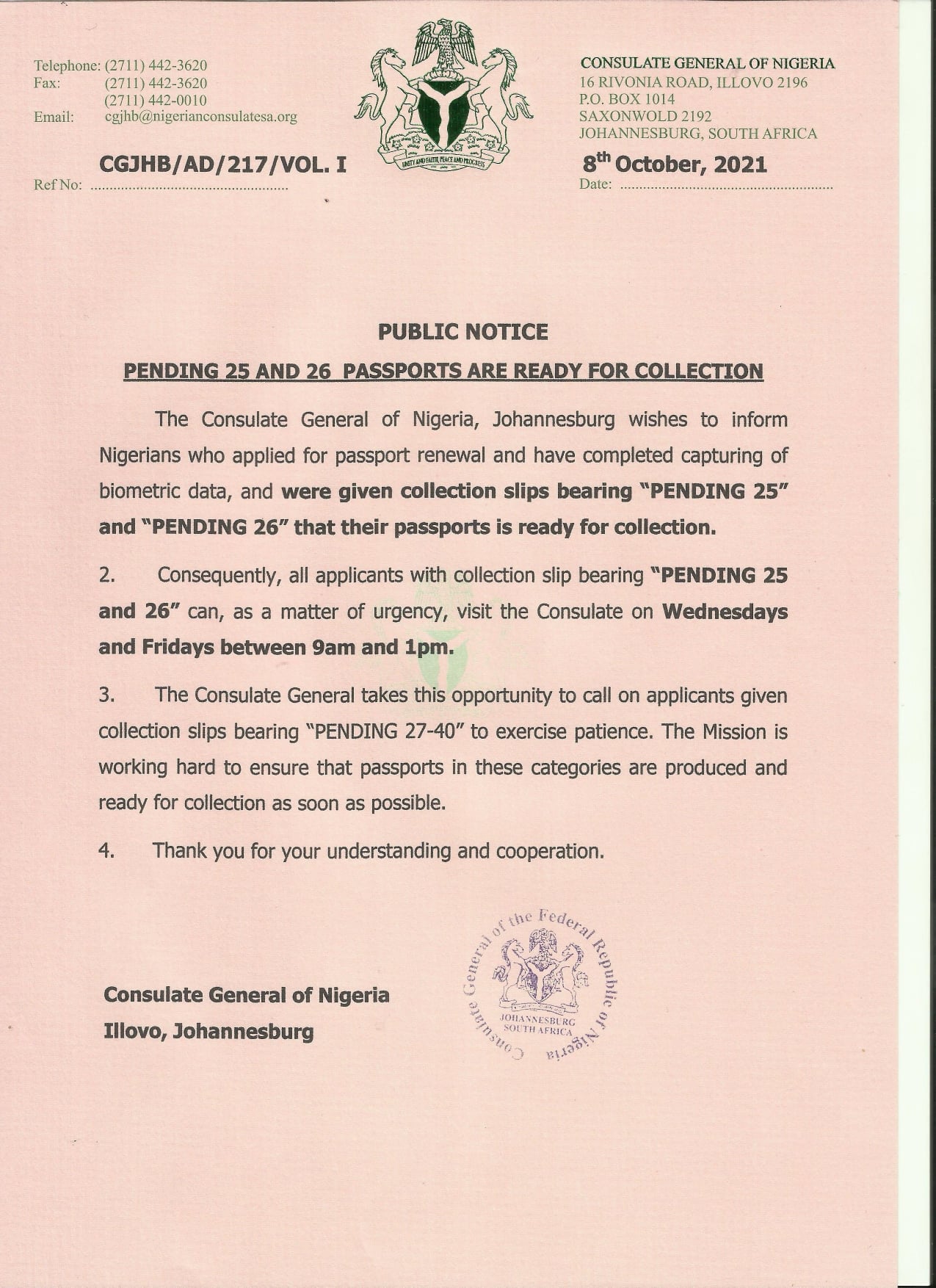 The Consulate General of Nigeria, Johannesburg wishes to inform Nigerians who applied for passport renewal and have completed capturing of biometric data, and were given collection slips bearing "PENDING 25" and "PENDING 26" that their passports are ready for collection.