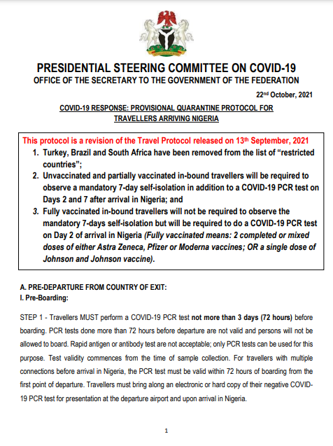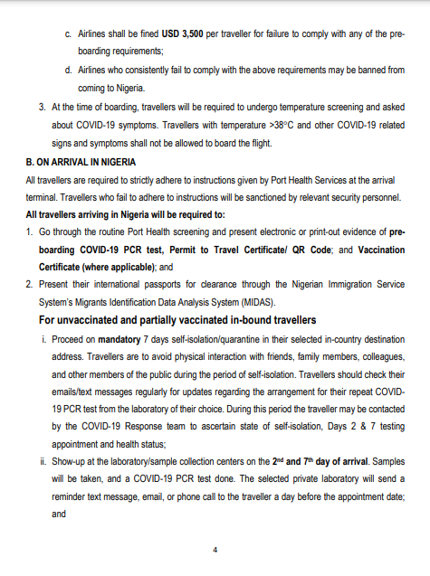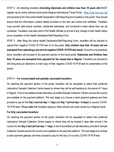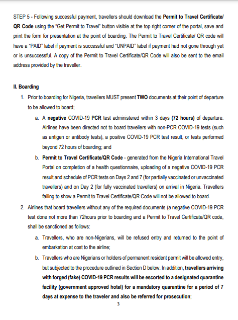 b. Permit to Travel Certificate/QR Code - generated from the Nigeria International Travel Portal on completion of a health questionnaire, uploading of a negative COVID-19 PCR result and schedule of PCR tests on Days 2 and 7 (for partially vaccinated or unvaccinated travellers) and on Day 2 (for fully vaccinated travellers) on arrival in Nigeria. Travellers failing to show a Permit to Travel Certificate/QR Code will not be allowed to board.