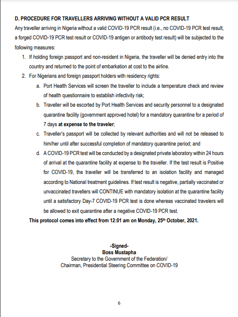 Any traveller arriving in Nigeria without a valid COVID-19 PCR result (i.e., no COVID-19 PCR test result, a forged COVID-19 PCR test result or COVID-19 antigen or antibody test result) will be subjected to the following measures: