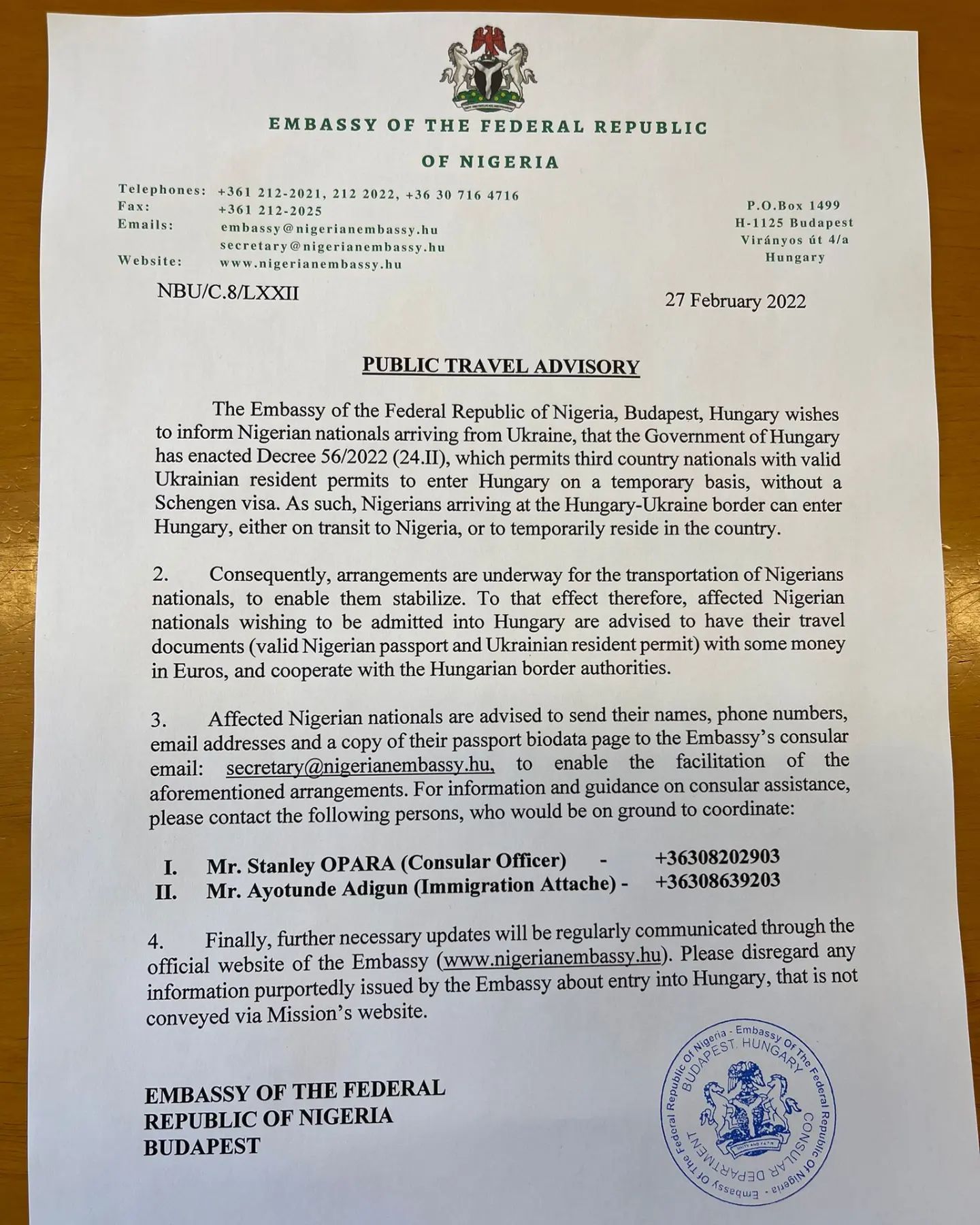 The Embassy of the Federal Republic of Nigeria, Budapest, Hungary wishes to inform Nigerian nationals arriving from Ukraine, that the Government of Hungary has enacted Decree 56/2022 (24.II), which permits third country nationals with valid Ukranian resident permits to enter Hungary on a temporary basis, without a Schengen visa. As such, Nigerians arriving at the Hungary-Ukraine border can enter Hungary, either on transit to Nigeria, or to temporarily reside in the country.